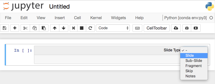 The slides are created in notebooks like normal, but you’ll need to designate which cells are slides and the type of slide the cell will be. In the menu bar, click View > Cell Toolbar > Slideshow to bring up the slide cell menu on each cell.